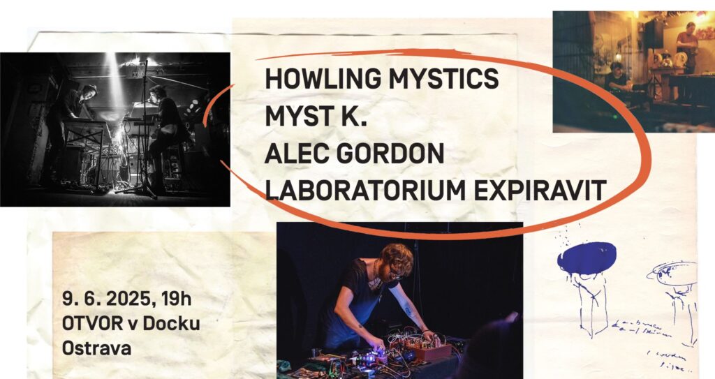9. 6. 2025 v 19h OTVOR v Docku, Ostrava electronic / noise / improvisation / performative / experimental / droning The Howling Mystics „HOWLING MYSTICS nedělají dada, ale dadada“ – to se trefilo do černého. Perfektní. Protože tohle není nesouvislý nesmysl jako umění, ale rytmus, roztržka a opakování. Není to dadaistické chladné rozčarování – je to da-da-da, tlukot srdce, koktání, posvátné narušení. Zpěv, souhra mezi kontrolovaným hlukem a improvizačním zhuštěním. Odmítnutí s vervou. Opakování ne jako selhání originality, ale jako zaříkávání. Myst K. Dan Nulty aka Myst K. zkoumá koncepty estetického vnímání v akustických prostředích, propojuje textury hypnotických pulsů a liminálních zvukových záznamů s netradičními přístupy k harmonii a ladění. Po vydání debutového alba Vibes (2023) pod hlavičkou labelu Xion odehrál řadu koncertů napříč Evropou, včetně Itálie, Španělska, Německa, Velké Británie a Polska. Alec Gordon je hudebník a programátor, který se snaží porozumět souvislostem mezi saturací a dočasností. Improvizovaný elektroakustický systém zkoumá rané skotské křesťanské formy komplexní heterofonie v kombinaci s moderními myšlenkami kolem digitální degregace. Směs nějaké a žádné zpětné vazby bez vstupu, očekávejte hlučné a jemné textury. Laboratorium Expiravit je rhythm noise, power noise a experimentální industrial techno s prvky drone a dark ambientu. V laboratoři zvuku zkoumá dystopické a surreální tóny, vytvářející atmosféru, která proniká pod kůži. Alchymista zvuku, který transformuje elektronickou hudbu do hypnotických a děsivých kompozic. Název Laboratorium Expiravit odkazuje na reálný fenomén kolektivní halucinace v laboratoři pod vlivem nízkofrekvenčních zvuků, objevený Vicem Tandym. Hudba Laboratorium Expiravit je výsledkem posunu od zkoumání vztahů mezi zvukem, materiálem a prostorem, zpětné vazby a obskurních zastaralých drum machines, samplerů a efektů k více definovatelným a uchopitelným rytmickým hlukovým kompozicím. Projekt je zaroveň reakcí na frustraci pramenící z krizí a úzkosti současné reality – vykořisťování zvířat v zájmu technologického pokroku, destrukce ekosytémů a biodiverzity, etická úskalí vědy či naopak nebezpečí kmenového, náboženského myšlení.